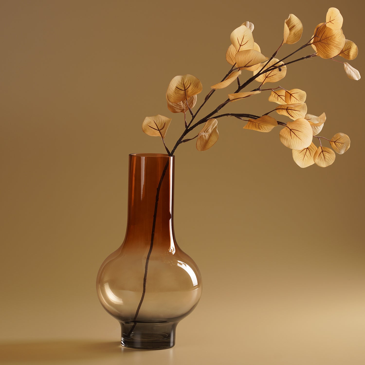 This deep amber glass vase features a bulbous base merging into a sleek cylindrical neck for visual contrast. Its minimal silhouette and rich hue add modern sophistication to fresh floral arrangements and standalone displays.